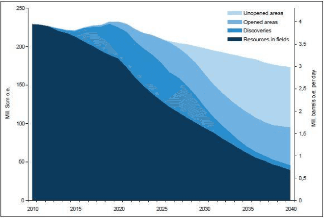 However, Norway also expects to continue producing significant volumes of oil and gas for decades. The Norwegian Petroleum Directorate (NPD) has stated that it will be possible to “maintain production from the [petroleum] sector at a very high level for decades to come”. Indeed, as illustrated in Figure 1, the Ministry of Petroleum and Energy and NPD have projected only a slight decline in oil and gas production through 2040.