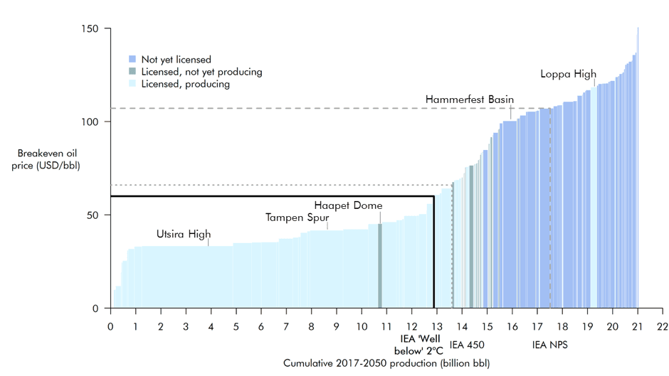 The break-even costs of several Norwegian oil resources are also shown in Figure 2. Some existing resources, such as Utsira High and Tampen Spur, would remain viable in a 2°C scenario with loweroil prices. However, higher-cost projects in some areas that have yet to be licensed, such as the Hammerfest Basin, as well as some existing projects, appear to require higher break-even oil prices, and therefore would not be economic in a “well below 2°C” scenario.