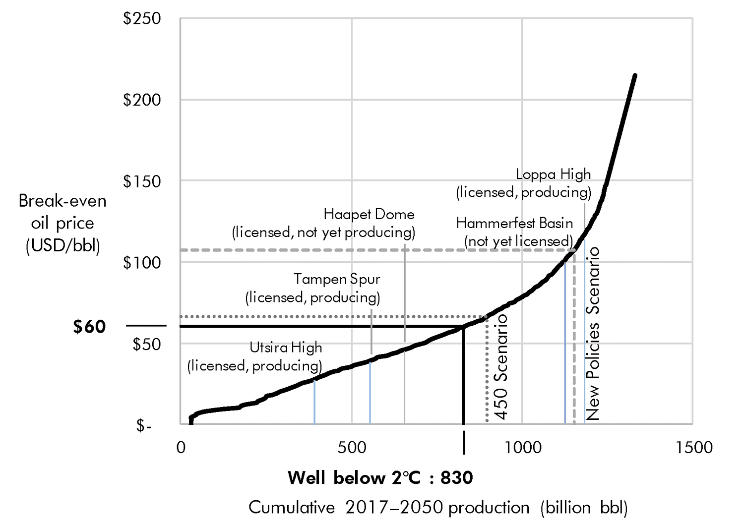 Our analysis requires two components: an estimate of cumulative global oil consumption in the chosen 2°C scenario and an assessment of the break-even cost of oil production (an oil cost curve). Our oil consumption estimate is based on the International Energy Agency’s (IEA) analysis of global oil production, by region, in a scenario designed to be consistent with the Paris goal to keep warming “well below 2°C”.We estimate this to be 830 billion barrels. (The “well below 2°C” scenario envisions somewhat less oil production than IEA’s longstanding 450 Scenario, which assumes a 50% chance of limiting warming to 2°C.) For the second part of our analysis, we use an oil production cost curve to identify the lowest-cost resources consistent with this 830 billion barrel global oil budget.