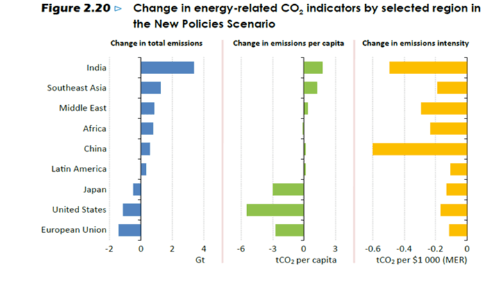 Generelt er IEAs World Energy Outlook en fortelling om at det skjer et skifte i energisystemene, men at forandringene går altfor sakte i lys av klima. Et viktig måltall for dette, er gjennomsnittlig CO₂-utslipp pr kilowattime i kraftproduksjon. Her faller snittet i New Policy Scenariet fra 670 gram i 2013 til 530 gram i 2040. Det er en endring som ikke på langt nær følger avkarboniseringstakten som er nødvendig for å nå togradersmålet.