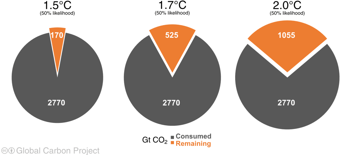 Forskerne i Global Carbon Project konkluderer med at det fra og med 2025 kan slippes ut omtrent 170 milliarder tonn CO2 før budsjettet for 1,5 grader er oppbrukt (med minst 50 prosents sannsynlighet). For 2 grader «gjenstår» det 1055 gigatonn CO2.