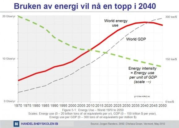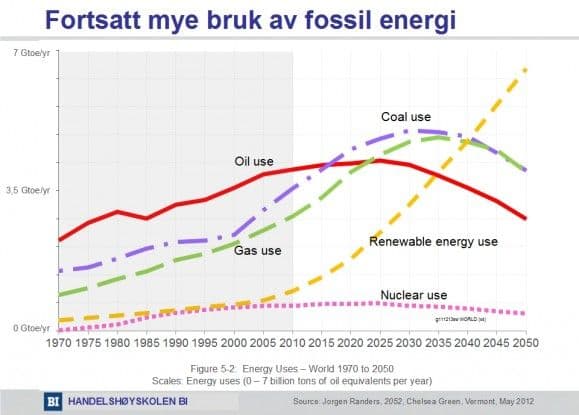 Når det gjelder global energibruk vil vi nå en topp allerede i 2040 – som en følge av avtakende vekst i BNP og fortsatt bedring av energieffektiviteten (energibruk per BNP-enhet, se figur over). Men etter 2040 vil verdens energibruk avta år for år. Og bruken av fossilt basert energi vil nå en topp enda tidligere, som en følge av en imponerende økning i produksjonen av fornybar strøm og varme. Men fortsatt vil hele 60 prosent av energibruken i 2052 være fossilt basert – som en følge av videreføring av den tregheten vi har sett i energi- og klimapolitikken siden Rio-møtet i 1992 (se figur nedenfor). Men bruken av kull, olje og gass vil være raskt fallende, og etter hvert bli erstattet med strøm og varme basert på sol, vind, vann og biomasse.