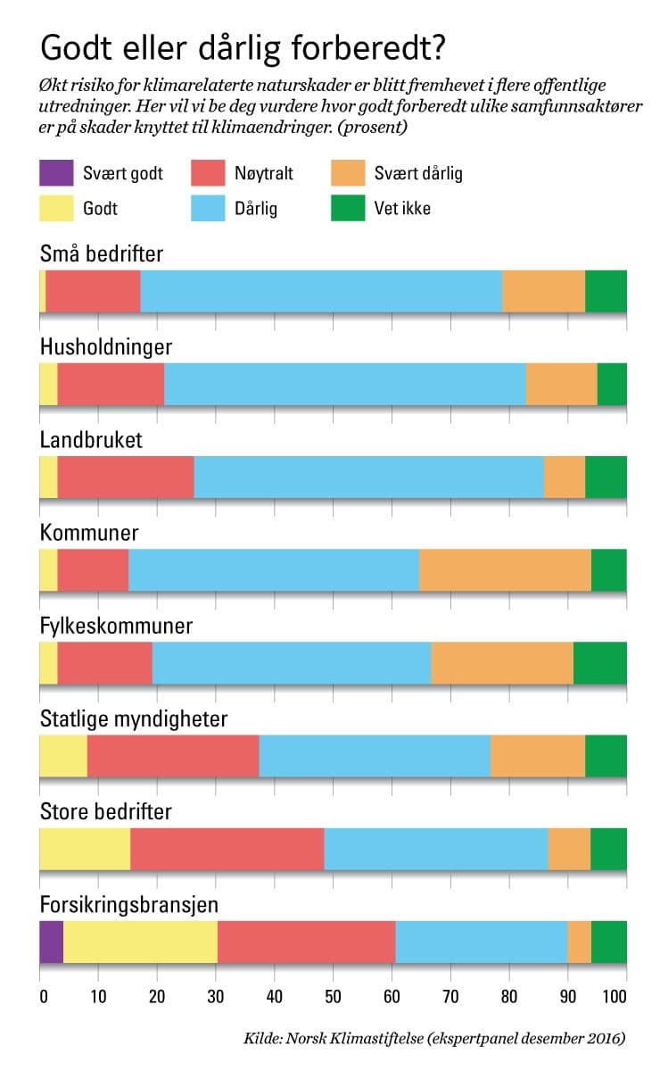 Ekspertpanelets tilbakemelding er likevel at alle samfunnsaktører, fra husholdninger og næringsliv til kommune og stat, har mye arbeid foran seg før de kan si seg godt forberedt på skader knyttet til klimaendringer. Blant de åtte aktørene/institusjonene vi spurte om, er det bare forsikringsbransjen som får noe i nærheten av bestått (30 prosent mener denne bransjen er svært godt eller godt forberedt).
