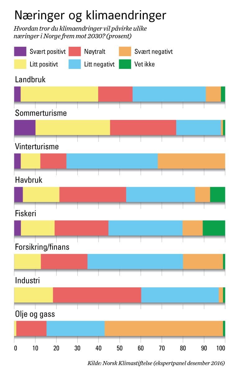 Vinterturismen går derimot vanskelige tider i møte, ifølge panelet. 75 prosent tror klimaendringer vil påvirke denne næringen litt eller svært negativt frem mot 2030.