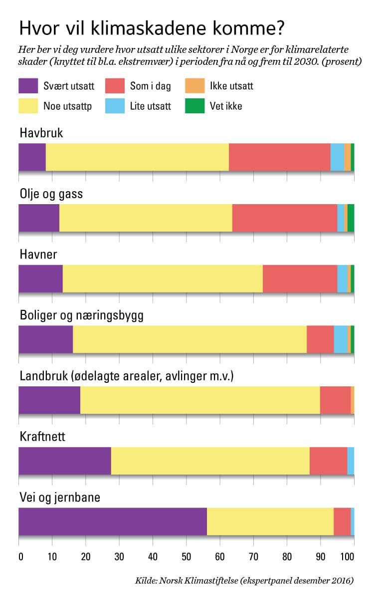 I Norsk Klimastiftelses undersøkelse ble ekspertpanelet spurt om hvordan klimaendringer vil påvirke næringer i Norge, hvor godt ulike samfunnsaktører er forberedt på skader knyttet til klimaendringer, og hvor utsatt forskjellige sektorer er for klimarelaterte skader. Videre ble panelet bedt om å vurdere fremtidig prisutvikling på forsikring.