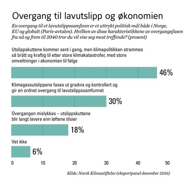 De fleste i panelet – 46 prosent – tror overgangen blir turbulent. Utslippskuttene kommer sent i gang, men så fører klimakatastrofer til at klimapolitikken strammes kraftig til, med store omveltninger i økonomien til følge.
