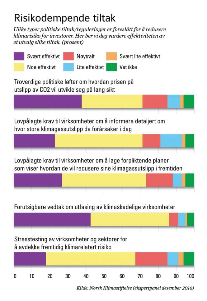 Det viktigste risikoreduserende verktøyet for myndigheter er å sette en pris på karbonutslipp, fremholder BlackRock i sin rapport. Også ekspertpanelet slutter seg til dette. 71 prosent sier at følgende tiltak er svært eller noe effektivt for å redusere klimarisiko for investorer: "Troverdige politiske løfter om hvordan prisen på utslipp av CO₂ vil utvikle seg på lang sikt".