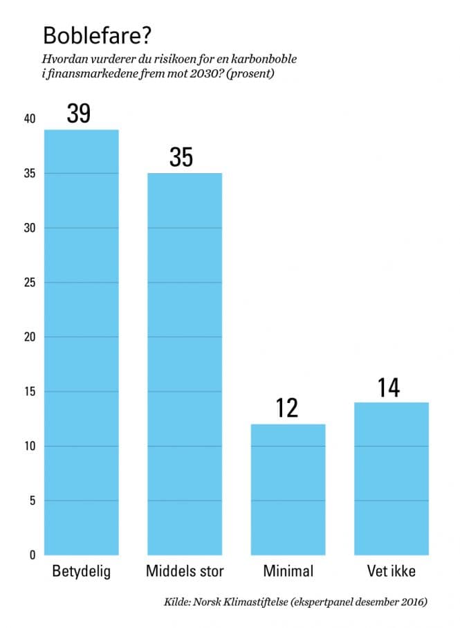 Risikoen for en karbonboble er betydelig, mener 39 prosent. 35 prosent anser risikoen som "middels", mens 12 prosent valgte svaralternativet "minimal". Å forutsi bobler i finansmarkedene er notorisk vanskelig, så det er kanskje ikke så rart at så mange som 14 prosent svarte "vet ikke" her.