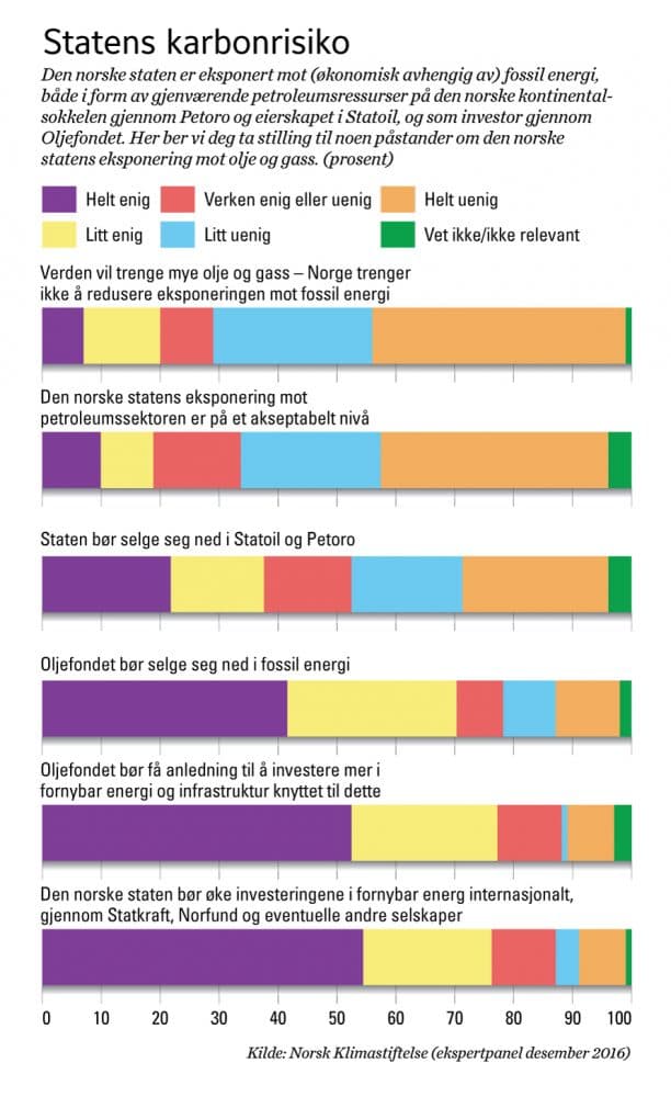 Tendensen i panelets svar på de ulike påstandene er klar: Det er et ønske om at staten på ulike måter reduserer sin eksponering for risiko knyttet til fossil energi. For eksempel er 70 prosent helt eller litt enig i påstanden om at "Oljefondet bør selge seg ned i fossil energi." Det er likevel rom for nyanser: Panelet er delt i spørsmålet om staten bør selge seg ned i Statoil og Petoro, med et knapt flertall mot et slikt nedsalg.