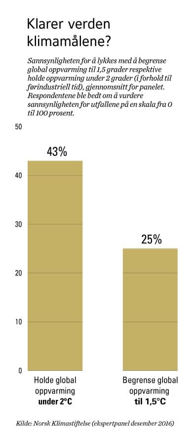 Panelet gir altså verdenssamfunnet en 43 prosents sjanse til å klare togradersmålet. Selv 1,5 grader er det en viss mulighet for – dette målet gir panelet en 25 prosents sjanse. Det er store svingninger i enkeltsvarene, fra 10 til 95 prosents sjanse for 2 grader, og fra 0 til 76 prosents sjanse for 1,5 grader.