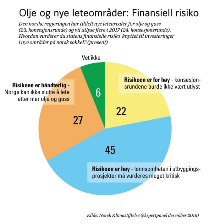 Risikoen er håndterlig, mener 27 prosent – Norge kan ikke slutte å lete etter mer olje og gass. De fleste i panelet, 45 prosent, mener risikoen er høy og at lønnsomheten i utbyggingsprosjekter må vurderes meget kritisk. Et mindretall på 22 prosent synes at risikoen er for høy og at konsesjonsrundene ikke burde vært utlyst.