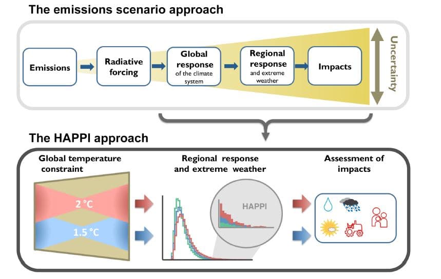 Grunnen til at man nå kan snu på flisa, er at det allerede eksisterer store mengder av data fra de nevnte tradisjonelle modellberegningene, blant annet fra forrige IPCC-rapport. Flere modellsentra enn NorESM er med på dette gjennom det internasjonale samarbeidet «HAPPI», som står for Half a degree Additional warming, Prognosis and Projected Impacts. Dermed blir det gjort store mengder beregninger for å bedre kunne skille systematiske klimaforskjeller mellom 1,5 og 2 grader og tilfeldige naturlige variasjoner og modellusikkerhet.