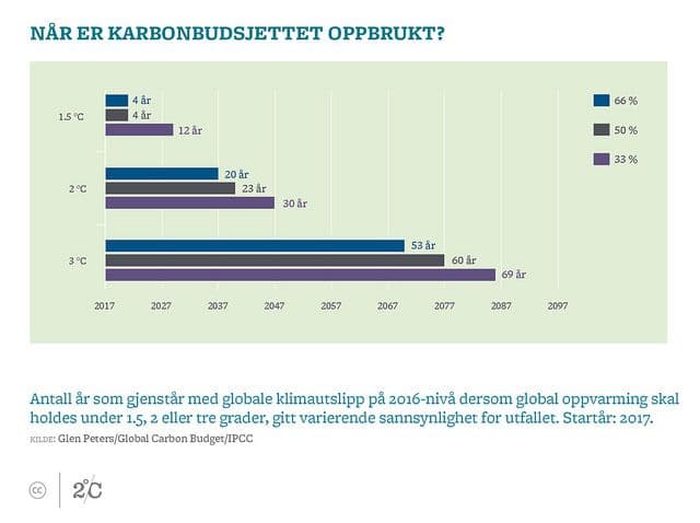 Mange er skeptiske til om vi faktisk kan klare å begrense den globale oppvarmingen til maksimalt 1,5 eller to grader. Oppvarmingen følger konsentrasjonen av CO2 i atmosfæren, og i år har verdiene for første gang ligget over 400 ppm. Det er en milepæl av det urovekkende slaget. Karbonbudsjettet for kloden vår tyder på at vi allerede har bidratt med om lag to tredjedeler av det vi kan slippe ut for at det skal være sannsynlig å holde oss under togradersgrensen.