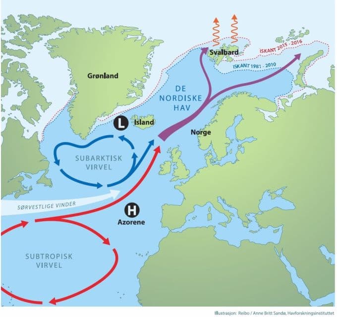 Mye tyder på at issmelting der atlanterhavsvannet kommer inn i Arktis hovedsakelig skyldes varme vannmasser og i mindre grad varm luft. Når isen er borte om vinteren, slik det faktisk har vært de siste månedene, blir det en spesielt stor varmeoverføring fra hav til atmosfære, og vi får høye lufttemperaturer.