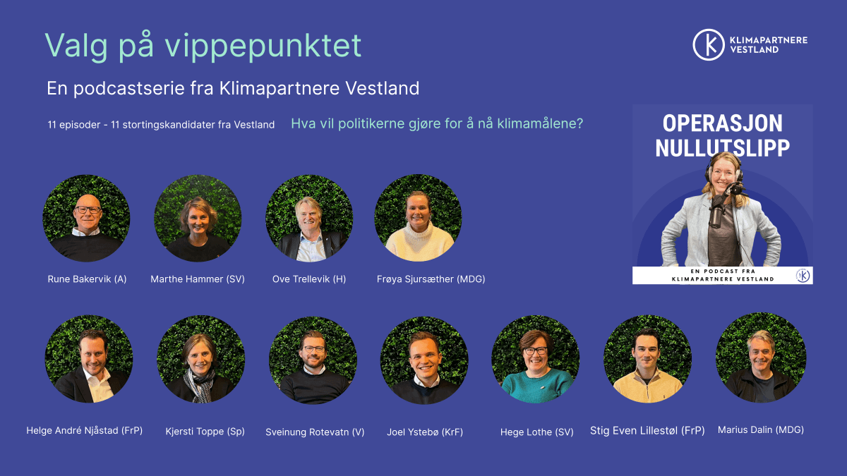 I elleve episoder snakker elleve stortingskandidater fra Vestland om hva de vil gjøre for å nå klimamålene. Gjestene i podcasten er blant dem som skal styre landet fra Stortinget de neste fire årene – en periode som blir avgjørende for at Norge skal nå klimamålene vi har forpliktet oss til.