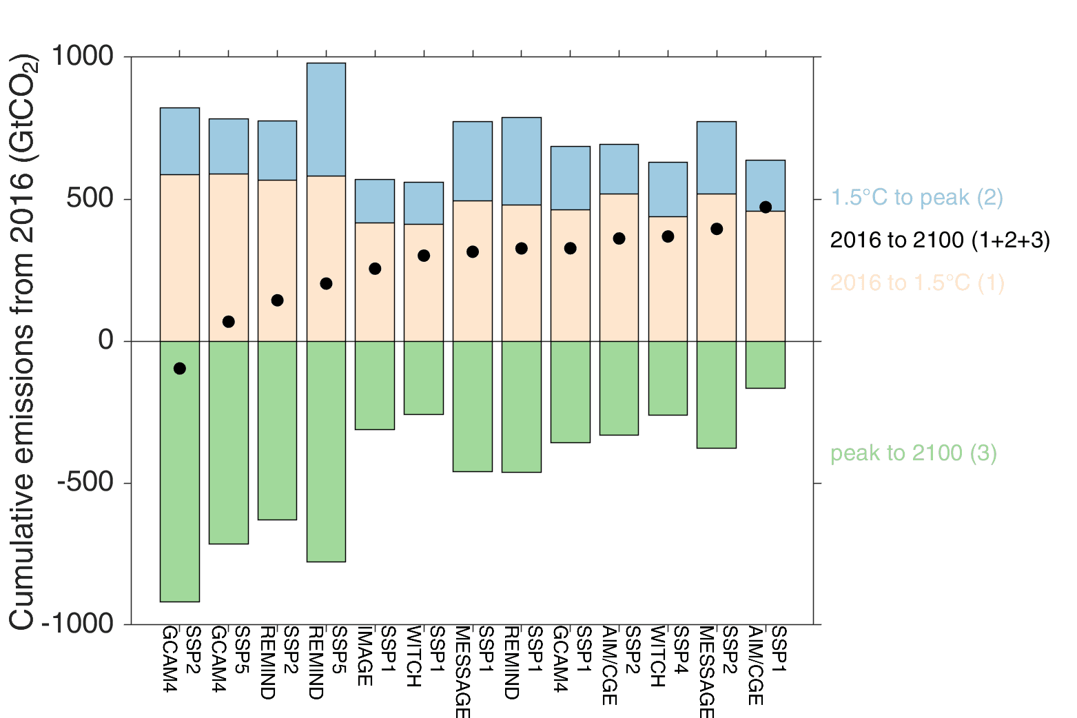 The following bar chart shows the cumulative emissions for each of the 1.5°C scenarios, decomposed into the different definitions, corresponding to the colours in the animation above. The orange is the exceedance carbon budget, the orange plus blue is the peak carbon budget, and the orange, blue, plus green is the avoidance carbon budget (black dot).