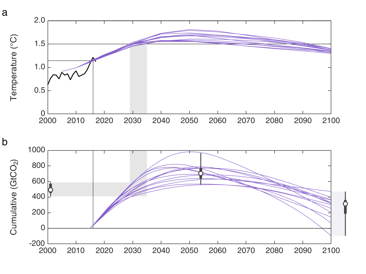 The peak carbon budget is easy to define and corresponds approximately to the year of peak temperatures. However, even though these are all «below 1.5°C» scenarios, since they first exceed 1.5°C before returning (peak and decline), the maximum temperature is between 1.6–1.8°C, well over 1.5°C. If we used the peak carbon budget, 1.5°C would be permanently exceeded. In a sense, the peak carbon budget only tells half the story. It does not reveal the need for negative emissions. With a peak budget we also begin to see more variation across the carbon budgets in different models and scenarios.
