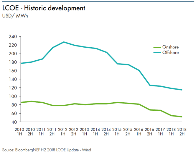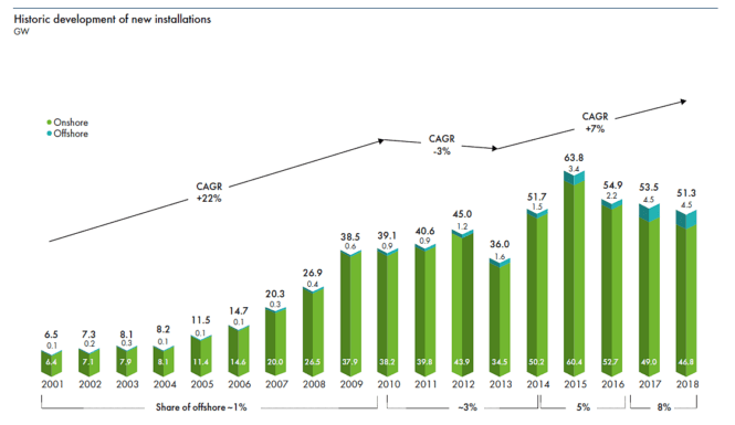 Vi starter med noen tall om hvor mye vindkraft som er bygd ut i verden. Grafen over viser tallene, per 31.12.2018. Kina er størst, fulgt av USA og Tyskland. Landbasert vind er langt større enn offshore, 586 GW på land mot 23 GW til havs. Innen offshore vind er Storbritannia det største markedet.