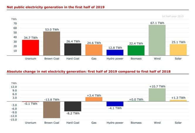 I kommentarfeltene i vindkraftmotstandernes ekkokamre raljeres det særlig mye over Tyskland. Tyskland har bygd mye vindkraft, og i første halvår i år ble det produsert 67,1 TWh vindkraft i landet. Så langt i år har hver fjerde kWh produsert i det tyske kraftsystemet kommet fra vindkraft. Samlet var andelen fornybar energi i den tyske kraftproduksjonen nær 50 prosent. Tyske energidata er lett tilgjengelige og Fraunhofer-instituttet publisererjevnlig godt visualisert tallmateriale. Den neste grafen viser kraftproduksjonen i Tyskland, fordelt på kilde, så langt i år.