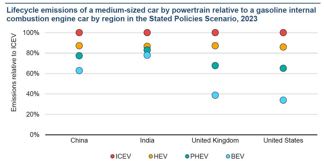 I et livssyklusperspektiv sparer helelektriske biler 50 prosent klimagassutslipp sammenlignet med biler med forbrenningsmotor, ifølge IEA. Dette er et globalt gjennomsnitt. Innsparingen blir større i land med en større andel fornybar energi i kraftmiksen. Livssyklus-beregningen inkluderer utslipp fra produksjon av bilen (inkludert materialer), bruk og vraking/demontering.