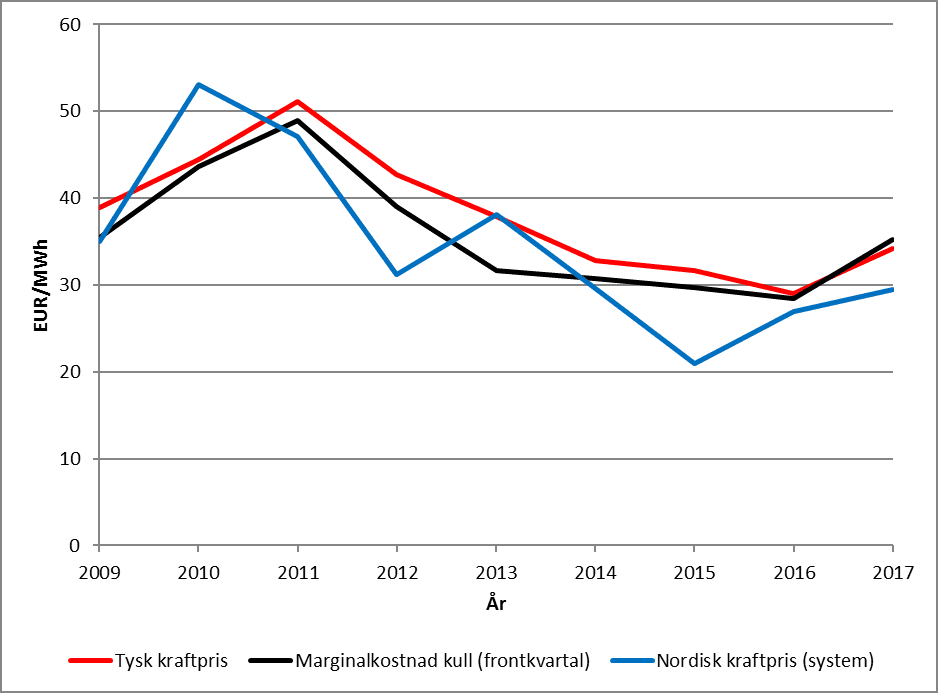 Kraftprisene økte fra slutten av 2016 og gjennom 2017 fordi prisen på kull økte med om lag 40 prosent. Prisen på CO₂-kvoter var relativt stabil i denne perioden og hadde liten betydning for denne prisøkningen. En økende andel av fornybar energi har heller ikke hatt særlig stor betydning for kraftprisen fram til i dag. Det skyldes at det i de fleste timer har vært behov for å ta i bruk kull for at tilbudet skal møte etterspørselen. Da settes altså kraftprisen av marginalkostnaden til kullkraft.
