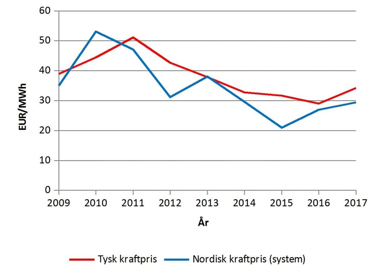 Til tross for at Norge foreløpig ikke har noen direkte kobling til kraftmarkedet i Tyskland, kun via Danmark og Sverige, har nordiske, og da også norske, kraftpriser ligget omtrent på samme nivå som tyske kraftpriser de siste årene. I løpet av en periode på fem år, fra 2010–11 til 2016, har den nordiske og tyske kraftprisen blitt halvert. Nordisk kraftpris har variert noe mer fra år til år. Det skyldes i hovedsak at nordisk kraftpris i større grad er påvirket av hydrologi, ettersom norsk og svensk vannkraft utgjør en stor andel av den nordiske kraftproduksjonen. Våte år med høy vannkraftproduksjon har gitt relativt lave nordiske kraftpriser, mens tørre år med lite produksjon har gitt relativt høye priser, sammenlignet med tysk kraftpris.