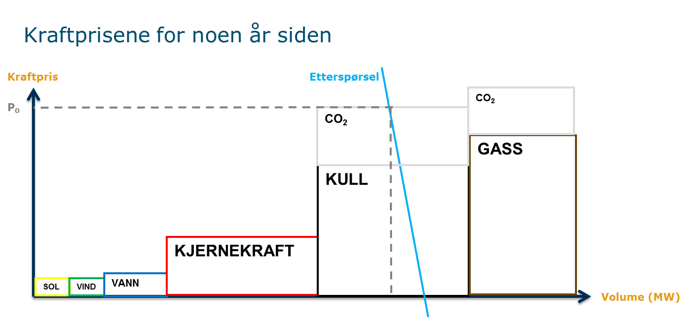 Med den tilgjengelige produksjonen i kraftmarkedet for noen år siden, var det svært få eller ingen timer der kraftproduksjon fra solkraft, vindkraft og vannkraft var stor nok til å dekke hele etterspørselen. Det måtte fylles på med kjernekraft og kullkraft for at produksjonen skulle være stor nok til å dekke etterspørselen. Derfor ble kraftprisen i de fleste timer for noen år siden satt av marginalkostnaden til kull. Det samme ser vi i dag, til tross for at fornybarandelen har økt kraftig. Figurene illustrerer at utviklingen fra høy kraftpris for noen år siden til relativt lav kraftpris i dag, skyldes at marginalkostnaden til kull har falt. Kullprisen var nesten dobbelt så høy i 2011 som i 2016, samtidig som CO₂-prisen var mer enn dobbelt så høy i samme periode. De lave kraftprisene kan med andre ord i liten grad forklares av økende andel fornybar kraftproduksjon og medfølgende kraftoverskudd.