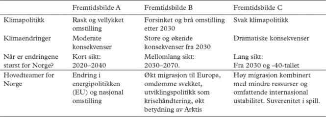 Klimarisikoutvalget håndterer usikkerheten knyttet til effektene av klimaendringer på norsk økonomi ved å tegne tre fremtidsbilder (NOU 2018:17, s. 51–52). Disse fremtidsbildene er basert på omfattende forskningsmateriale, og danner et godt utgangspunkt for hvordan klimakrisen vil påvirke norske interesser og omgivelser internasjonalt.
