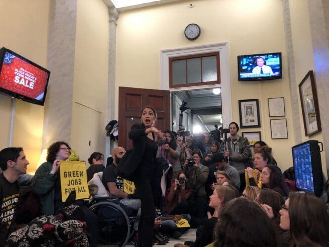 En novemberdag i 2018 okkuperte rundt 200 unge mennesker kontoret til Nancy Pelosi, speakeren i Representantenes hus i den amerikanske Kongressen. De rullet ut bannere med slagord som «Grønne jobber for alle», holdt appeller og sang protestsanger. Det nyvalgte kongressmedlemmet Alexandria Ocasio-Cortez møtte opp for å støtte dem. 51 personer ble arrestert.
