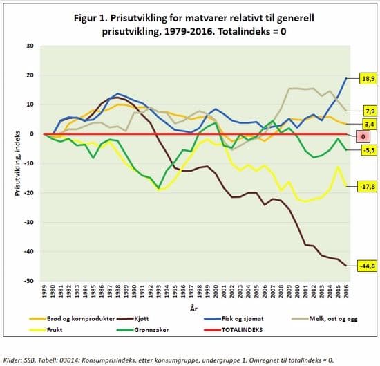 Prisutvikling for matvarer i Norge relativt til generell prisutvikling, 1979-2016. Indeksert. (Kilde: SSB)
