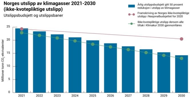 Hva er nytt? Norge får nå et utslippsbudsjett for ikke-kvotesektoren i perioden 2021-2030. Utslippene må ned år for år. Men når regnskapet skal gjøres opp i 2030, er det tiltakenes samlede effekt over tid som er målestokken – altså den samlede mengden spart CO₂. For å nå 50 prosent reduksjon må den samlede utslippsreduksjonen være omkring 30 millioner tonn i perioden fra 2021-30 målt mot – hold dere fast – referansebanen som er en fremskrivning av Norges ikke-kvotepliktige utslipp i Nasjonalbudsjettet for 2020.