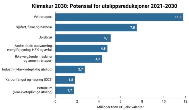 I korte trekk: Klimakur 2030 presenterer enomfattende katalog over mulige tiltak som kan gi utslippsreduksjon.Veitransport er den største sektoren, fulgt av sjøfart, fiske og havbruk,jordbruk, avfallshåndtering og såkalt ikke-veigående maskiner. Hvis man sertransport under ett, er det den klart største sektoren. Luftfarten er en del avkvotesektoren, og inngår ikke i Klimakur 2030.