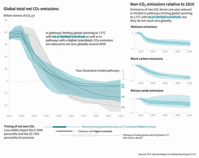 Figuren nedenfor er fra 1,5-gradersrapporten, og viser den banen for utslipp som hele verden må følge for at temperaturen skal kunne flate ut på 1,5 graders global oppvarming. De grønne linjene er forskjellige slike utslippsbaner/modeller som fører til at den globale oppvarmingen bremser opp på 1,5 grader. (Selv med disse grønne banene må verdens land hente 4 til 6 milliarder tonn CO2 ut fra atmosfæren pr år etter 2060, for å unngå videre oppvarming.)