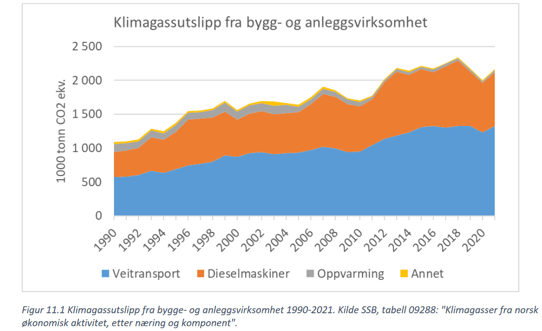 I bygg- og anleggsaktiviteten er utslippene ifølge rapporten «om lag doblet siden 1990». De gjorde et byks fra 2010 til 2013 – og har senere ligget relativt stabile rundt 2,2–2,3 millioner tonn CO₂e per år.
