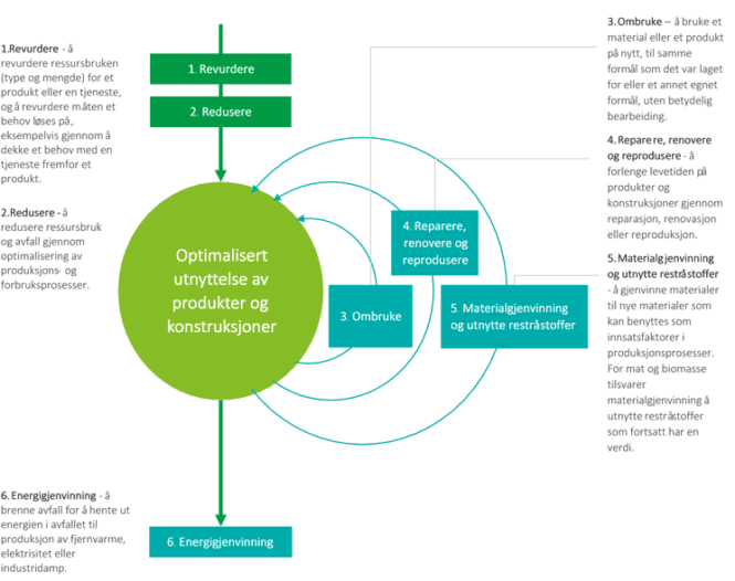 Illustrasjonen under er hentet fra et arbeid konsulentselskapet Deloitte har gjort for Klima- og miljødepartementet. Deloitte skriver at de mest virkningsfulle tiltakene for en sirkulær økonomi er å forebyggeforbruk og avfall, dernest å legge til rette for lengst mulig levetid av et produkt gjennom ombruk, reparasjon, renovering og reproduksjon. Det er i de første punktene på listen at det er mest å hente, ifølge Deloitte. Ifølge denne logikken må man altså førstrevurdere ressursbruken for et produkt eller en tjeneste, kan et behov dekkes på en enklere og mer effektiv metode?