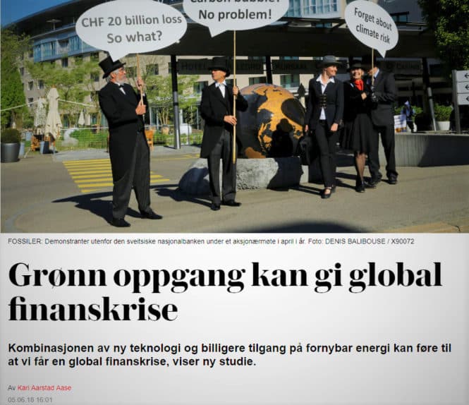 De siste årene har forskere og finansielle institusjoner advart om at vi kan oppleve ustabilitet i finansmarkedene fordi vi ikke klarer å organisere overgangen til lavkarbonsamfunnet jevnt og trutt. I stedet vil altfor mye skje uforberedt og på en gang, brått og kontant. UKs sentralbanksjef Mark Carney beskriver dette som ‘the transition risks that can arise through a sudden and disorderly adjustment to a low carbon economy,’ – blant annet i talen A Transition in Thinking and Action som han holdt på ‘International Climate Risk Conference for Supervisors, De Nederlandsche Bank, Amsterdam’ i april 2018. I juni 2018 omtalte VG en ny studie – publisert i tidsskriftet Nature Climate Change – som viser at et brått fall i verdier knyttet til fossilt brensel, kan kaste verden ut i nedgangstider og økonomisk kaos. Førsteamanuensis ved Radboud universitet i Nederland og Cambridge universitet i England – Jean-Francois Mercure – har ledet denne studien. (faksimile: vg 5. juni 2018).