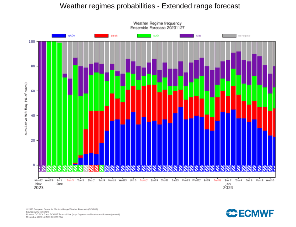 De nærmeste dagene skal vi altså være i værtypen NAO–, noe som rimer godt med de kalde langtidsvarslene. Utover i neste uke øker sannsynligheten for andre værtyper, og fra neste helg (9.–10. desember) og utover er det omtrent en tredjedels sjanse for NAO+, altså en mildere værtype.