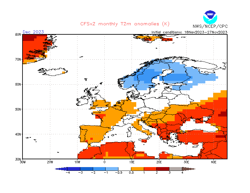 Helt til slutt tar vi med et oppdatert langtidsvarsel for hele desember. Det er produsert av den amerikanske værtjenesten NCEP og bygger på informasjon frem til 27. november. Her er prognosen for temperatur i form av avvik fra normalen for desember (klikk for å se oppdaterte prognoser til enhver tid):