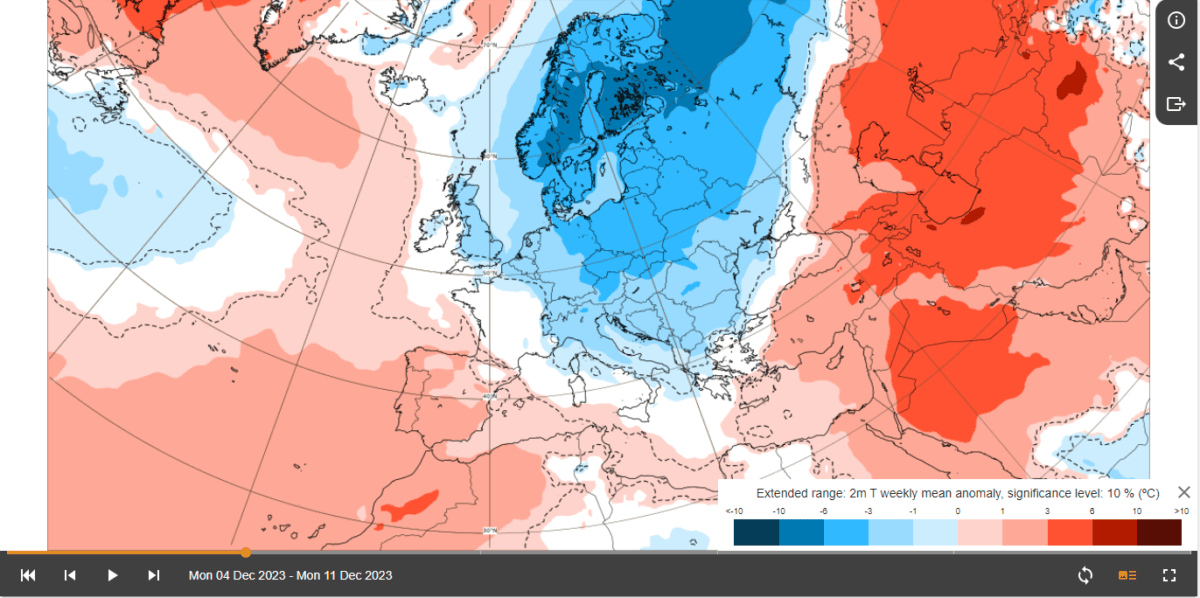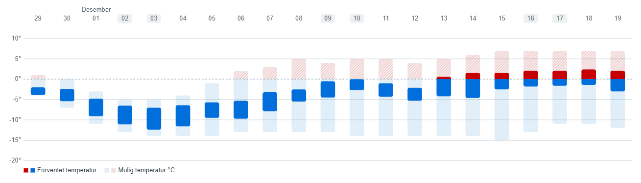 Bildet viser et gjennomsnitt av 100 prognoser som ble laget i går, og enheten er avvik i grader fra et gjennomsnittsklima for samme tid på året over de siste 20 år. Klikk på bildet for å komme til nettsiden der disse varslene ligger. Det går da an å bla seg fremover i tid. Uken etter, altså den som starter 11. desember, ser foreløpig kald ut i den nordlige delen av landet vårt. Men, det kan hende kulden holder taket i Sør-Norge også.