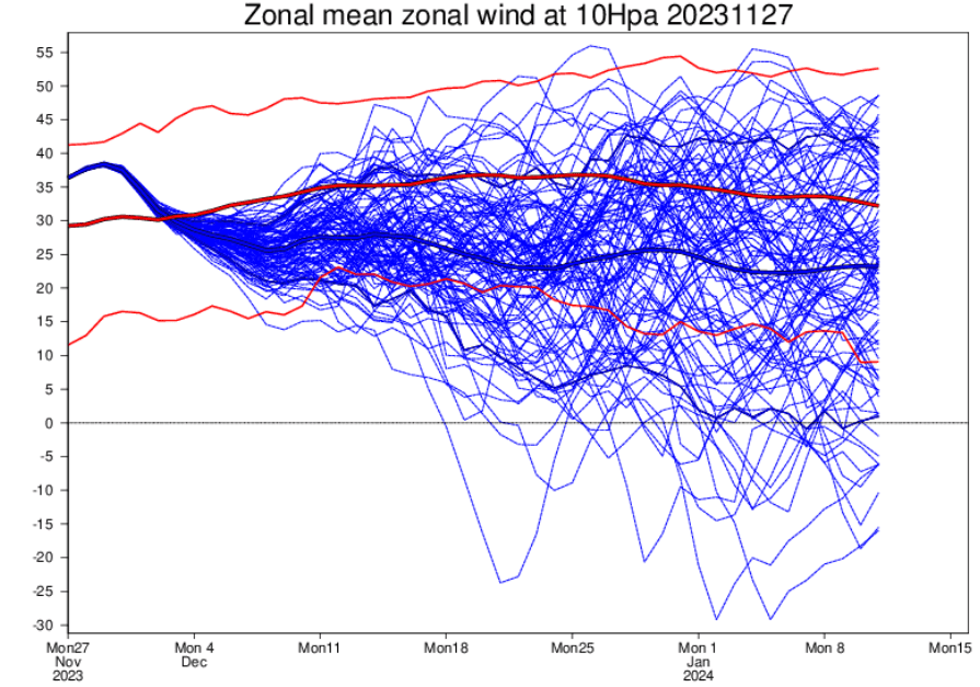 Vi ser at vindstyrken akkurat nå er litt høyere enn normalen (den tykke røde kurven), men at prognosene indikerer at vindstyrken de neste ukene kommer til å svekkes. Det er til og med noen enkeltprognoser som går under 0 m/s, det vil si at vinden snur fra vestlig til østlig. Slike hendelser kalles brå stratosfæriske oppvarminger.