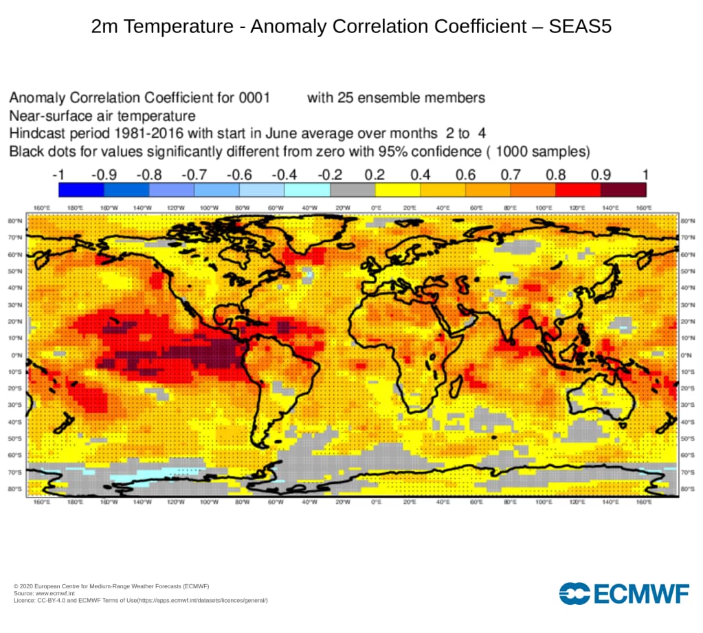 Noen spør seg sikkert om hvor treffsikre modellene er. Generelt treffer de best om vinteren, og særlig i forbindelse med en stratosfærisk oppvarming, slik vi opplevde i vinter. Et av de åtte modellsentrene, ECMWF, har laget en oversikt over treffsikkerheten for varsler for juli–september produsert i juni. På figuren under sier fargene noe om dette. Jo rødere farger, jo høyere treffsikkerhet. Prikkene angir områder der modellen har en statistisk signifikant treffsikkerhet.