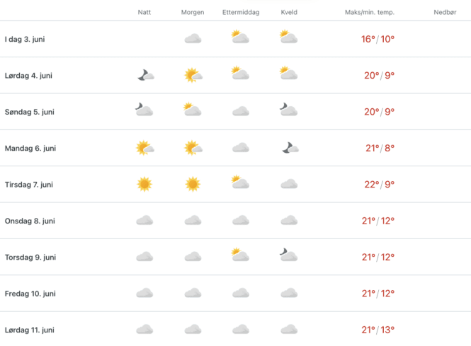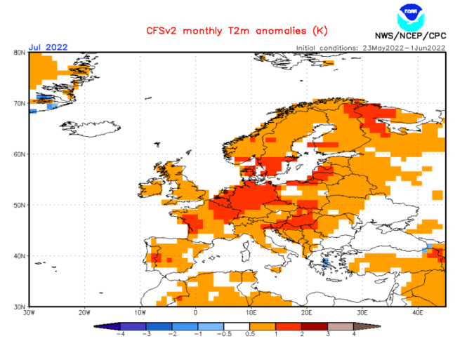 Når det gjelder juli, kommer vi med vårt sesongvarsel i midten av juni. Vårt tidlige varsel fra midten av mai ga lav sannsynlighet for at det skal bli særlig varmt. De oppdaterte amerikanske varslene (se under) indikerer en temperatur litt over normalt, men det er som forventet med tanke på den kraftige oppvarmingen i løpet av normalperioden (1991–2020). Temperaturen har økt med nærmere en grad, så et avvik på mellom en halv grad og en grad fra gjennomsnittet over hele perioden er ikke et stort utslag. Til sammenligning var juli 2018 fem grader eller mer varmere enn normalt flere steder i Sør-Norge.