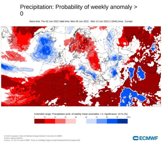 Ikke noe nedbør å snakke om (Storm melder noe nedbør mot slutten av perioden, men kun små mengder). Dette rimer bra med den nyeste månedsvarselet (les mer om de ulike typer varsler her). Her er sannsynligheten for mer nedbør enn normalt neste uke: