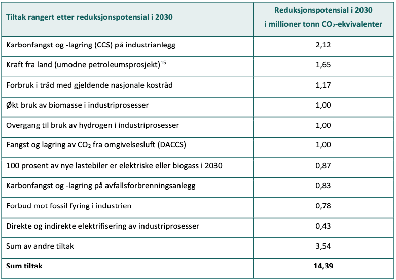 Karbonfangst og -lagring (CCS) og elektrifisering (av sokkelen og transportsektoren) er dei to tiltaka som vil gi størst utsleppskutt dette tiåret, men ikkje ein gong dette vil vere tilstrekkeleg. Det trengs innsats over heile fjøla – både stort og smått. Lista under dekker 75 prosent av utsleppspotensialet som Miljødirektoratet har greia ut: