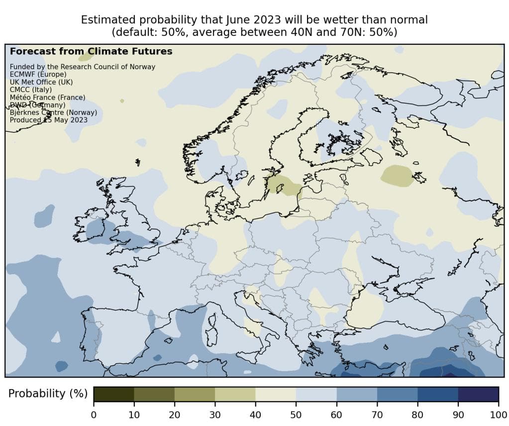 Nedbørskartet finner vi på bildet under. Hele landet ligger i et område med 40–60 prosent sannsynlighet for våtere forhold enn normalt. Som regel må man utenom dette intervallet, altså lavere enn 40 prosent eller høyere enn 60 prosent, for å kunne si at det er et tydelig signal fra modellene. Usikkerheten er høy, og vi må vente til det nærmer seg enda mer for å kunne si noe om nedbøren i Norge i juni. Lenger sør i Europa er det derimot signaler om en relativt sett våt juni. Det er gode nyheter for landbruket.