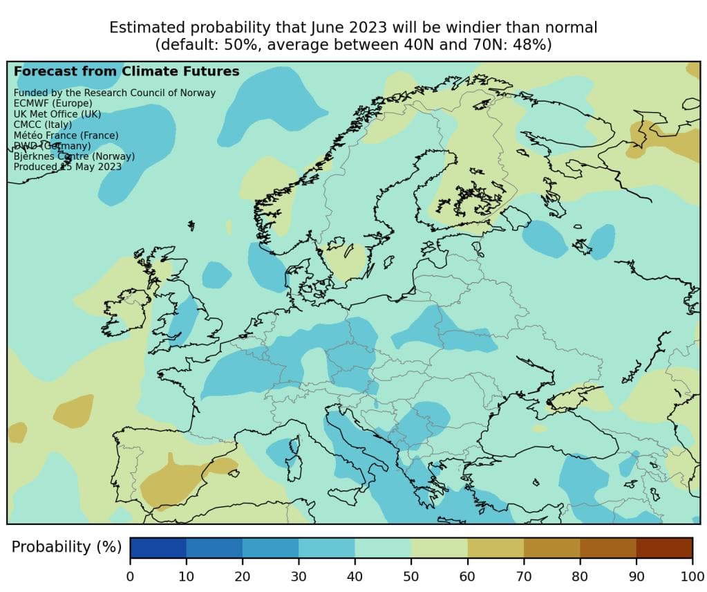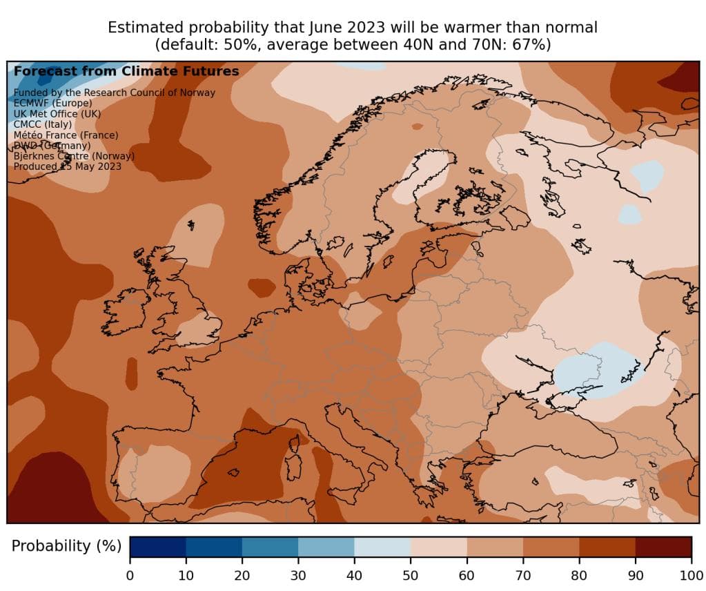 Prognosene for juni er vist på bildet under, i form av sannsynligheten for at det blir varmere enn gjennomsnittet de siste tiårene.
