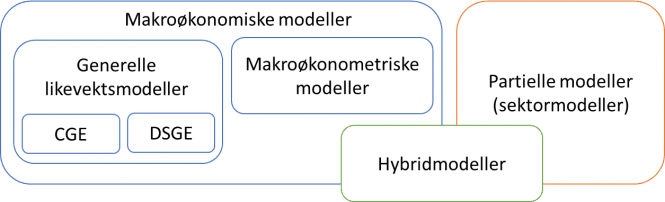Vi har sett nærmere på seks norske makromodeller, der enkelte brukes til klimaanalyser i dag, mens de øvrige brukes til andre formål. De sistnevnte er tatt med fordi de har egenskaper som er relevante for å forbedre eller supplere de andre modellene. De seks modellene dekker alle hovedtypene av makromodeller som er vist i figuren nedenfor (se Boks 1 for detaljer).