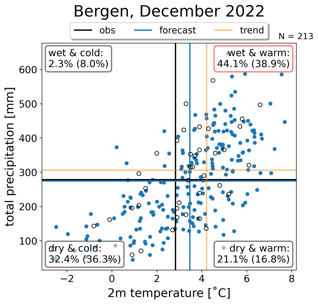 Prosenttallene i hver av de fire boksene angir hvor stor andel av de 213 scenarioene som befinner seg i hver kvadrant. Hele 44 % av de prognosene er i kategorien «varm og våt». Dette er altså det mest sannsynlige scenarioet, ifølge modellene. Tallet som står i parentes sier at modellene over tid plasserer 39 % av scenarioene i denne kategorien, så i år er det litt mer sannsynlig enn vanligvis. Kategorien «tørr og kald» er vanligvis nesten like sannsynlig (36 %), men i år er det ifølge modellene bare 32 % sannsynlig at desember i Bergen blir slik. Vi ser videre at det vanligvis er 17 % sannsynlig at desember i Bergen blir «varm og tørr», og at det i år er mer sannsynlig (21 %) enn det som er vanlig. Kategorien «kald og våt» forekommer (heldigvis) ikke så hyppig, da kun 8 % av modellprognosene pleier å havne her. I år er det enda mindre sannsynlig (2 %).