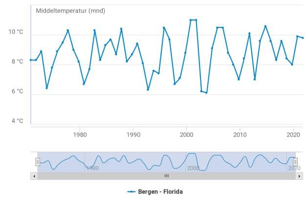 Det er særlig nedover på Kontinentet at vi finner høye sannsynligheter. Store deler av Norge ligger mellom 50 og 60 prosent. Når vi tolker dette, må vi ta med i betraktningen at normalperioden vår går helt tilbake til 1993. Siden den gang har temperaturen i Norge økt betydelig. Se for eksempel på årlig gjennomsnittstemperatur for Bergen på grafen under.