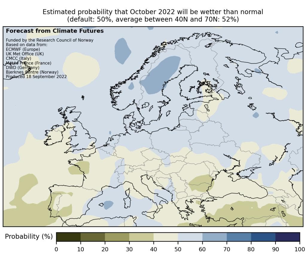 Mange er nok mer spent på nedbøren. Her er sannsynligheten for at oktober blir våtere enn normalt: